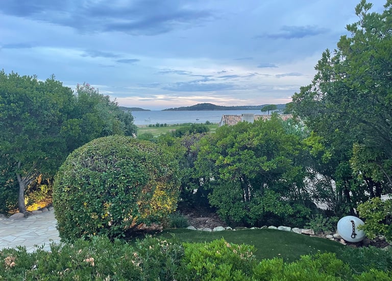 À deux pas de la mer, détendez-vous dans de beaux espaces extérieurs entourés de verdure, avec une vue imprenable sur la baie de Pinarello.